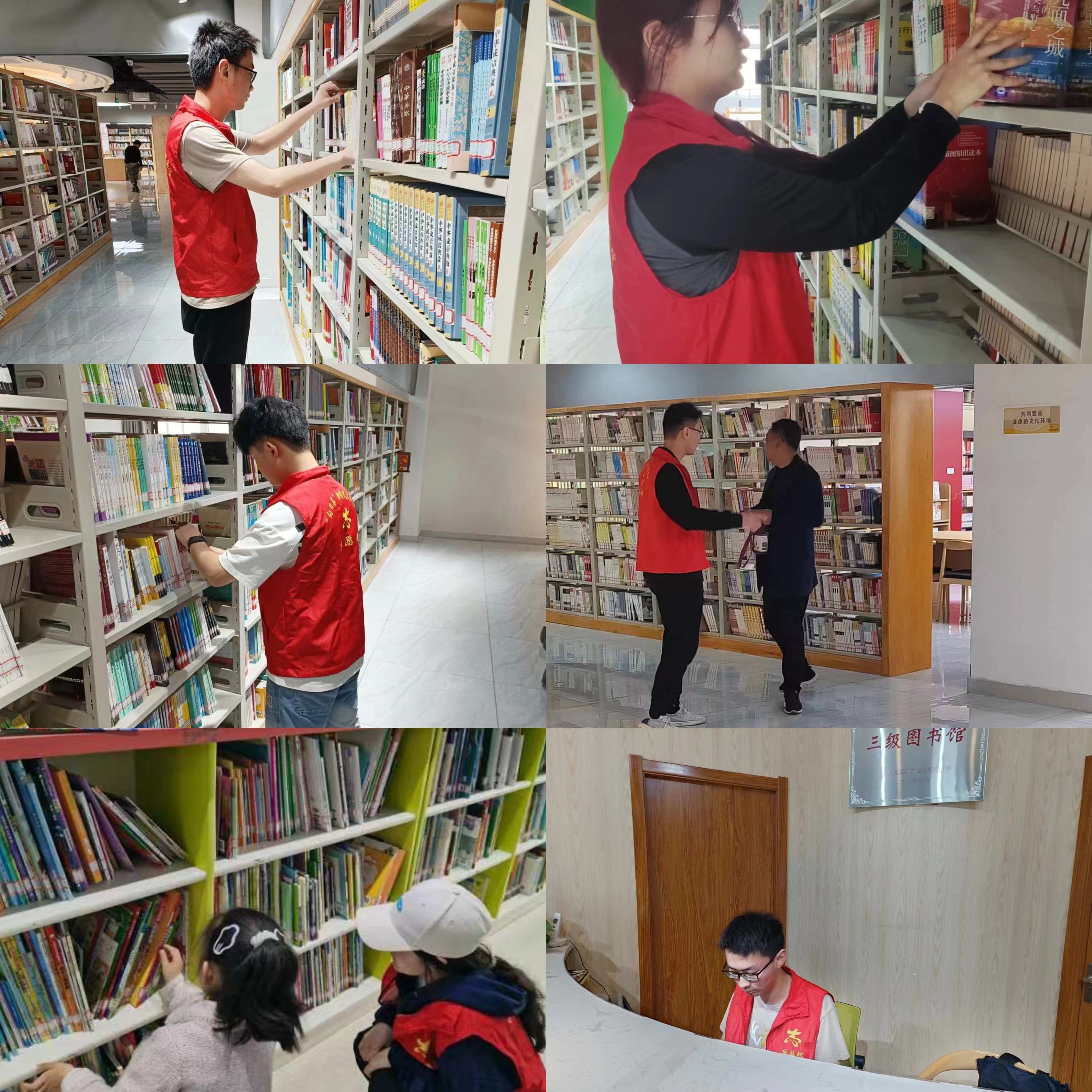 活动期间,“文竹”志愿者们身着统一服装,精神饱满地投入到紧张而有序的志愿服务中。根据工作分配,一组志愿者负责图书的整理归纳工作,穿梭于各个书架之间,仔细核对书标,将错位的书籍一一归位,确保每本书都能准确“回家”;另一组志愿者则专注于秩序维护,引导读者文明借阅,解答咨询,维护馆内环境卫生,确保每位读者都能享受到安静、整洁的阅读氛围。