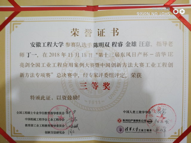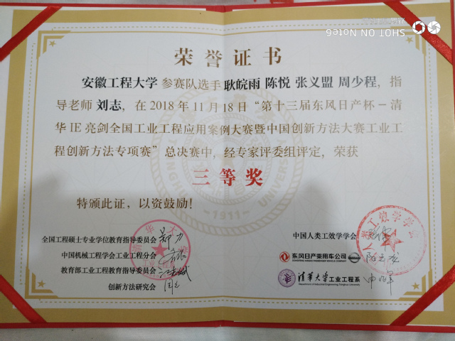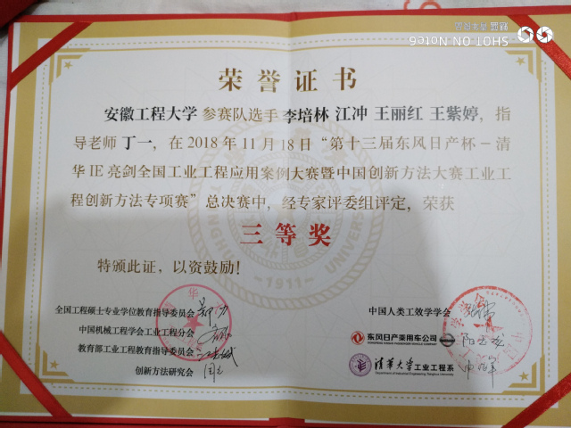 在本次比赛中,我校选派由丁一老师和刘志老师指导的工业工程系代表队(三队共12人)荣获第十三届东风日产杯清华IE亮剑全国工业工程应用案例大赛暨中国创新方法大赛工业工程创新方法专项赛三等奖。这是我校工业工程系首次在此项比赛中获奖。