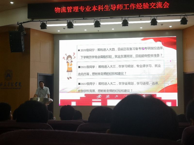 为贯彻落实学校“三专六全”育人实践工作要求,深入了解物流专业学生的学习状态和学业发展目标,切实回应各年级学生的重点关切,让学生有序起来,起来、“勤”起来,2023612日,物流科学系组织全体本科生导师学生C7楼报告厅召开工作经验交流会。本次会议由物流科学系主任程永宏主持,物流管理专业2020、20212022级共计200多名学生参会。