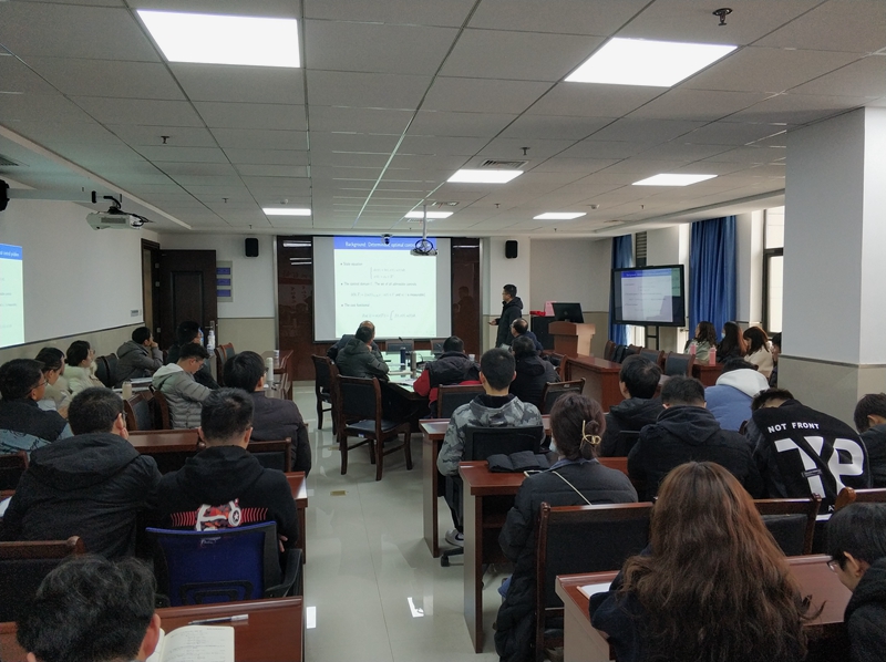 嵇少林教授作了题为《The Neyman-Pearson Lemma for convex expectations》的报告。嵇教授首先介绍了最近纽曼-佩尔森引理的研究现状,详细说明了在凸期望下纽曼-佩尔森引理的研究重点和难点以及主要结论,最后给出了该引理在金融市场中风险最小化问题的一个应用。