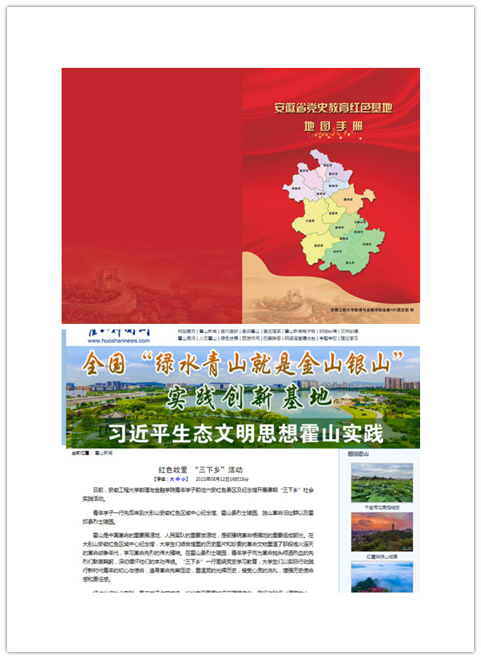 六月底暑假伊始,团队成员将安徽省内红色基地按照大革命、土地革命、抗日战争、解放战争四个时期进行划分,小组成员分为七个小组,实地走访、调研了六安市独山革命旧址群、霍邱县烈士陵园、大别山革命历史纪念馆,安庆市大石岭农民暴动纪念碑等二十一处红色基地,与当地居民、红色基地的工作人员进行交流,了解、记录当地历史和红色人物故事,目前已经完成绝大多数的红色基地的走访,“‘手边’的红色资源”地图册也已经初步完成编写和修订,希望未来可以实现地图册的捐赠和销售。此次实践成果与红色教育、专业教育与创新创业教育相结合,未来将面向省内乃至全国的青少年介绍安徽红色文化,达到传承红色基因,弘扬革命精神,厚植学生爱党爱国情怀的作用。