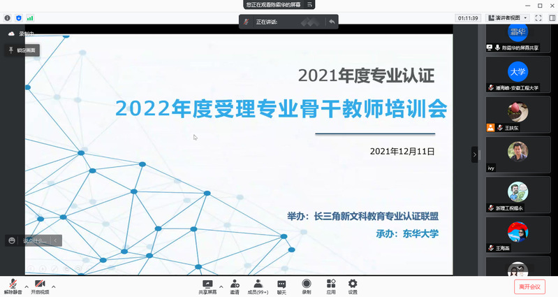 2021年12月11日下午,由长三角新文科教育专业认证联盟秘书处组织的“新文科专业认证培训会”在线上举行,数理与金融学院院长王传玉、副院长吴小太、金融工程专业负责人、专业教师参加培训会。