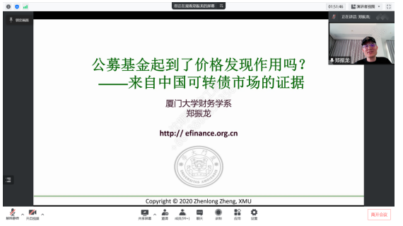郑振龙教授作了题为《公募基金起到了价格发现作用吗?——来自中国可转债市场的证据》的报告。以可转债市场为研究对象,从公募基金整体能否战胜市场为问题出发,通过排列组合对公募基金的持有比例、信息交易基金持有比例分析,讨论了信息交易基金的超额收益率来自系统性风险还是市场定价错误。给出了回归分析模型,通过对变量的的分析,说明了超额收益来自对市场定价错误的捕捉。