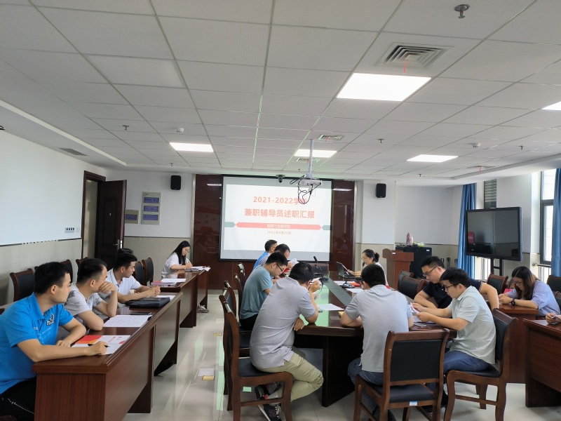 6月24日,数理与金融学院在图书馆1612会议室召开2021-2022学年兼职辅导员述职评议会,学院党委书记周毅仁、党委副书记何志恒、副院长吴小太及全体专职辅导员参加评议,学院13位兼职辅导员依次述职,学院申请2022-2023年度兼职辅导员的6位青年教师现场观摩学习。何志恒主持述职评议会。