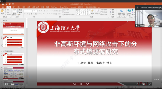 2022年9月3日晚,应研究生部和数理与金融学院邀请,上海理工大学博士生导师丁德锐教授做了题为《非高斯环境下与网络攻击下的分布式熵滤波研究》线上学术报告。校党委常委、副校长费为银、研究生部副主任刘宏建、数理与金融学院部分青年老师及研究生参加了本次报告会。报告会由刘宏建教授主持。