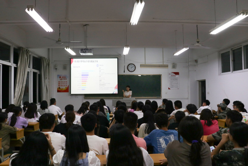 统计专业邀请05级统计专业程荣围绕统计学专业介绍与就业方向、统计所需思维与竞赛推荐、大学中如何进行人生规划几个方面为同学们上了统计学专业的入门课,她说统计学是关于搜集、整理、分析数据和解释数据的基础学科,统计学所培养的统计思维,是所有新兴行业的底层逻辑之一,就业领域广泛。她鼓励大家大学期间要多参加统计建模、市场调查、数学建模等类型的比赛,大学期间明确自己“要去哪里”“能干什么”“如何实现理想”几个问题的答案,并不断为之努力。