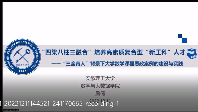 12月11日,数理与金融学院邀请安徽理工大学副教授詹倩作了题为《四梁八柱三融合”培养高素质复合型“新工科”人才——“三全育人”背景下大学数学课程思政案例的建设与实践》的线上交流报告,报告会由数理与金融学院副院长张培雨主持,承担公共基础课教学的全体教师以及部分专业课教师参加了本次线上报告会。