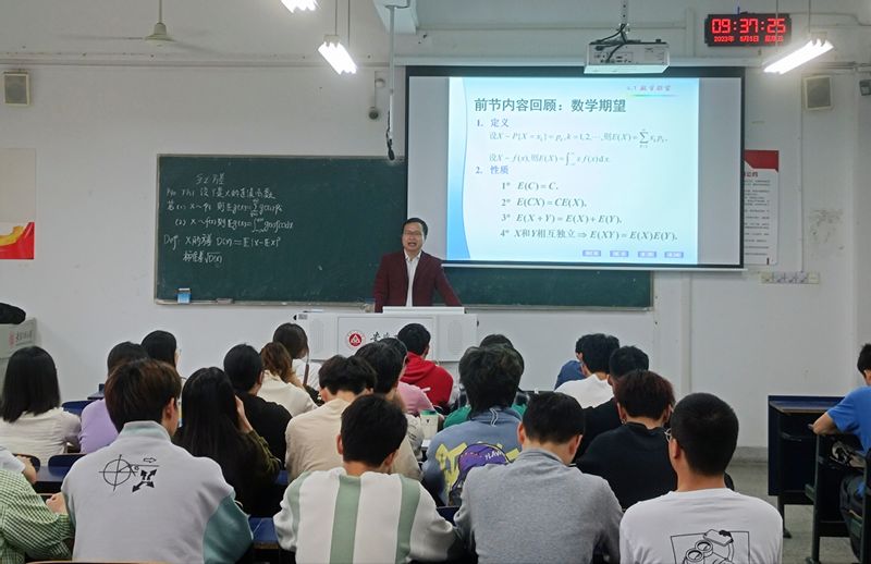 邓寿年老师讲授的内容是《概率论与数理统计》中数学期望和方差的基本性质。首先,邓寿年老师结合例题,对数学期望的概念和基本性质进行了回顾,并通过例题讲解让学生加深了对期望的概念和性质的理解。随后,邓老师结合实际,自然地引入方差的概念,并通过多媒体和板书相结合的方式对方差的性质进行了细致的讲解。邓老师的授课过程重难点的突出,课堂讲授内容娴熟,理论与实际相结合,深入浅出,让学生在课堂上能够清晰地理解概率论中数学期望和方差的概念。同时,邓老师还将课程思政元素自然融入课堂,激励学生大胆创新,引导学生用数学思维思考实际问题。邓老师的教学方式充分调动了学生的积极性和主动性,实现了知识传授、价值塑造和能力培养的多元统一。