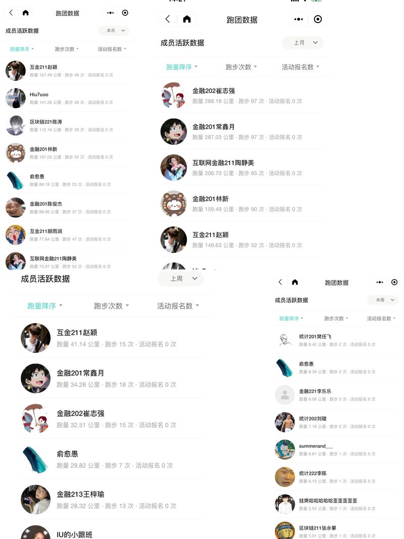 组织系列特色运动活动,激发学生运动兴趣,营造良好运动氛围。学院开展多期“早晨有约”活动,通师生联合早锻炼,开展学生喜爱的篮球、足球、网球、乒乓球、羽毛球、轮滑等体育运动,并在运动后师生共进早餐,畅谈大学生活,引导学生早起、早锻炼,培养运动兴趣,养成良好生活习惯和运动习惯,增强学生体质。开展“数”你“金”彩体能训练示范营,组织部分体育和健身特长学生、退伍学生带队开展体能训练,教授体能训练方法、技能和知识,贴近学生,用学生喜闻乐见的方式激发学生体育锻炼兴趣。每周举办一次“健跑达人”活动,学生使用运动软件“Keep”记录运动情况,根据运动的公里数和天数进行排名;每月评选“速度达人”“坚持小能手”等,培养学生的体育锻炼意识。已经累计开展11期,参与1097人次。加强班级两委建设,充分发挥班级学生骨干最用,以宿舍、班级为单位举办丰富多彩的体育运动活动。