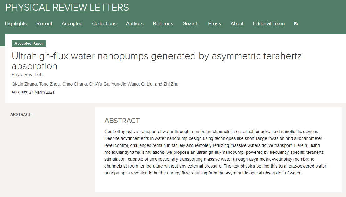 近日,我校数理与金融学院章其林课题组在纳米水泵领域取得突破性进展,相关成果以“Ultrahigh-Flux Water Nanopumps Generated by Asymmetric Terahertz Absorption”为题发表在国际顶级期刊《Physical Review Letters》上,这也是日韩欧美福利视频_黑人巨大人精品欧美三区_欧美成人另类人妖_欧美在线精品一区二区三区_欧美一区二区三区性视频_日韩精品欧美视频_性欧美极品xxxx欧美一区二区以第一单位发表在PRL上的研究成果。章其林副教授为论文第一作者,我校材料科学与工程学院刘琪教授,北京大学常超研究员以及上海理工大学朱智副教授为共同通讯作者。
