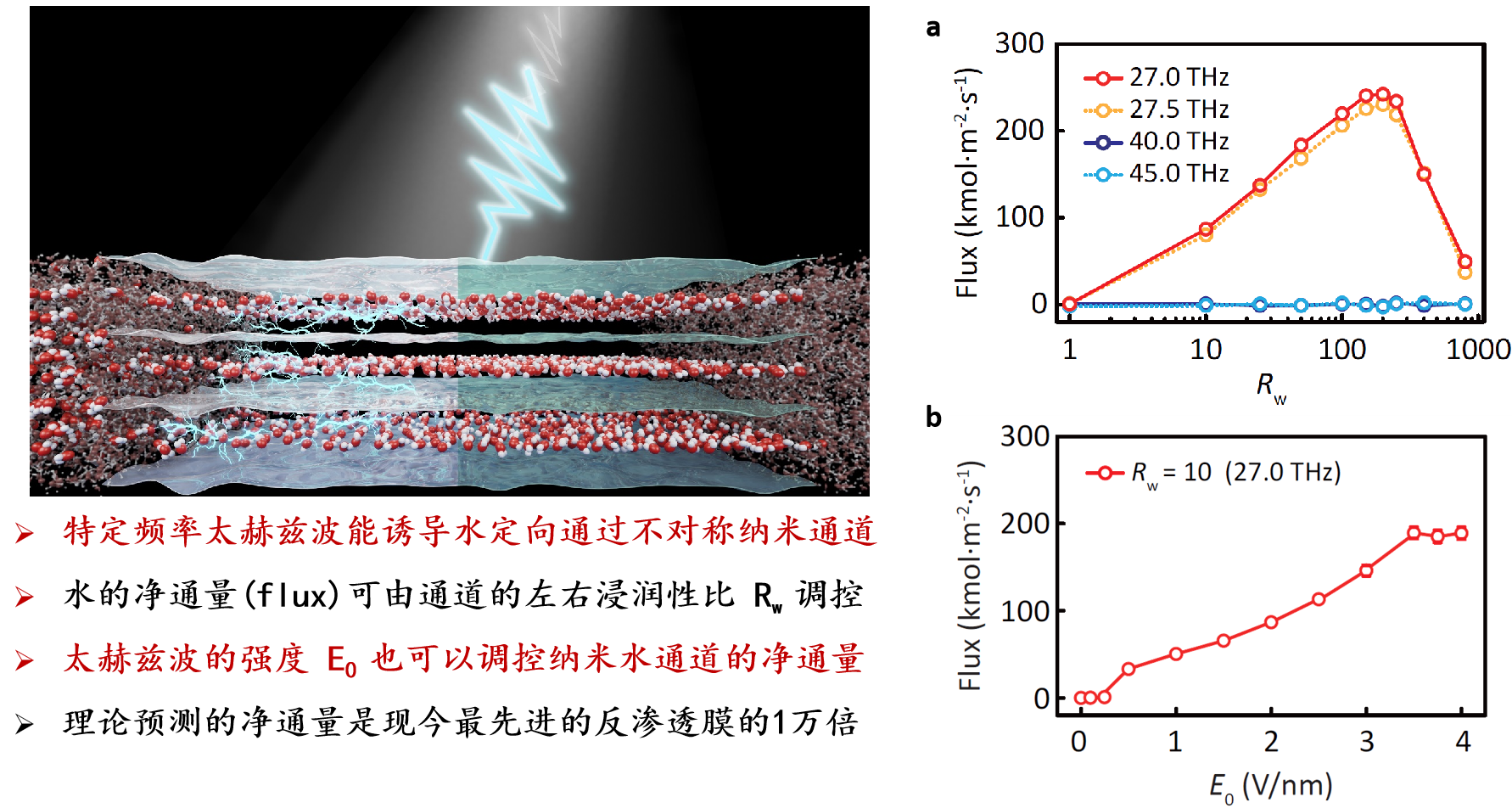 在纳米世界里,操控大规模水单向传输是一个巨大挑战,这是因为水分子是电中性且无磁矩,电场或磁场都无法驱动其单向流通。基于课题组前期研究成果 [Phys. Rev. Lett.  110, 254501 (2013);Nanoscale 8,1886(2016);Phys.Rev.Fluids 7,114202(2022)] 和生物主动输运机制的启示,在本研究中,团队成员通过模拟太赫兹频率的光辐照到左右不对称的二维纳米水通道上,发现特定频率的太赫兹辐照能诱导通道内受限水单向流通,其最大水通量能达到先进反渗透膜的1万倍左右。该工作开辟了太赫兹技术调控实现泵水通过纳米通道的新路径,首次提出“太赫兹光的不对称吸收引起能量流”这一光控水输运的物理机制。由于太赫兹波具有长程可控、高效无损和生物兼容等优点,该太赫兹供能的棘轮式分子泵机制不仅有望能应用在生物医学和过滤膜领域,帮助实现水和离子在生物/纳米通道中的高效精准输运, 同时也能进一步拓展太赫兹技术在过滤、脱盐、蒸发、能量转换和生物调控等领域的综合应用。研究工作得到了国家自然科学基金、安徽高校自然科学研究重点项目,以及芜湖市科技项目的资助。