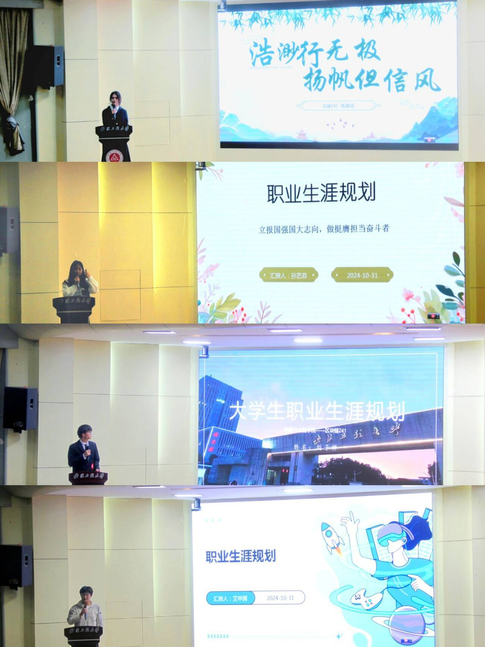 本次大赛以“立报国强国大志向,做挺膺担当奋斗者”为主题,旨在帮助2024级新生更好完成角色转变,树立职业目标,深化大学认知,强化自我管理,激发成长内驱力,为更好成长成才奠定基础。全体2024级新生撰写、提交大学生职业规划书,最终遴选出15份优秀作品进入决赛。决赛现场,各位选手围绕“自我认知”“职业展望”“未来规划”等方面进行职业规划展示,展现了将“小我”投身于“大我”,将个人理想融入强国实践的思想觉悟。