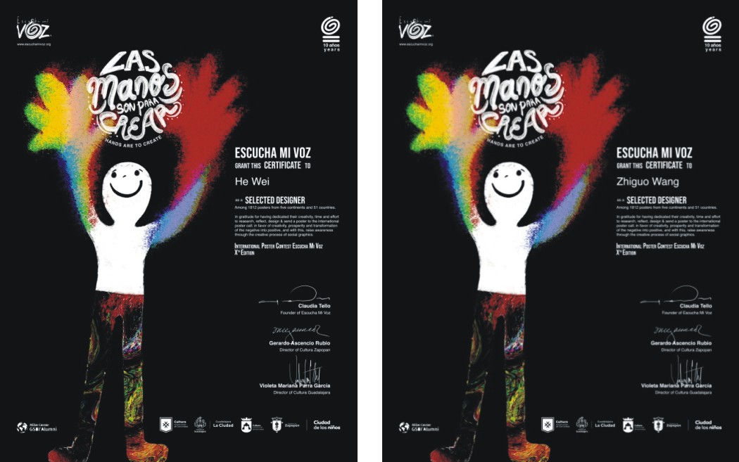 近日,由艺术学院史启新副教授指导的两位研究生何蔚、王治国分别收到来自墨西哥的获奖证书,他们的作品均入选墨西哥ESCUCHA MI VOZ国际海报展Top50。本届大赛共收到来自世界各地的设计作品1812件,最终评选出50件。这也是史启新老师连续三届指导研究生作品入选墨西哥ESCUCHA MI VOZ国际海报展。