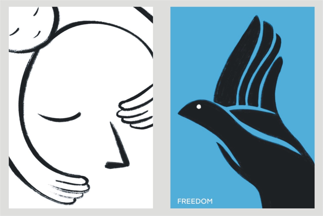 何蔚的海报作品《Don’t Cry》,使用简约的线条在画面中勾勒出两个人的形象,巧妙运用图形创意技巧,手掌掩住怀里的人哭泣的眼睛,寓意给予怀中的人爱的关怀,以此呼吁大家可以力所能及地互相帮助。