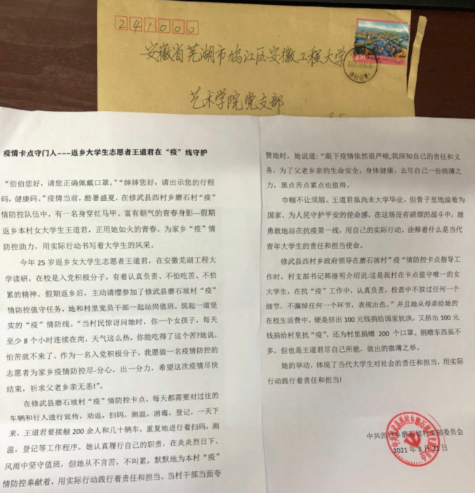 艺术研19入党积极分子王道君,在假期返乡后,主动请缨参加了家乡河南省修武县磨石坡村疫情防控值守任务。她身穿红马甲,和村里党员干部一起站岗值班,筑起一道坚实的疫情防线。村疫情防控卡点,每天都需要对过往的车辆和行人进行宣传、劝返、扫码、测温、消毒、登记,一天下来,王道君要接触200余人和几十辆车,“伯伯您好,请您正确佩戴口罩”“大姐您好,请出示您的行程码、健康码”重复地进行着扫码、测温、登记等工作程序。她认真履行自己的职责,在炎炎烈日下、风雨中坚守值班,但从不言苦、不叫累,默默地为本村疫情防控奉献着,用实际行动践行着责任和担当。村支部书记韩继明称赞道,刘道君是村里卡点值守唯一的女大学生,在疫情工作中,认真负责,检查中不放过任何一个细节,不漏掉任何一个环节,表现出示。她还从生活费中挤出100元钱捐给国家抗洪、100元钱捐给村里抗疫,还为村里捐赠200个口罩。王道君在没有硝烟的疫情战斗中勇敢地冲在第一线,用自己的实际行动,诠释着当代青年大学生的责任和担当使命。修武县西村乡磨石坡村党支部以信件的形式向学院党委通报了她的志愿服务过程。