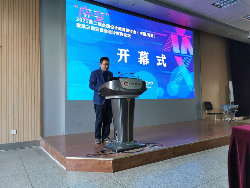 1024日上午,“应·变”2021第二届全国设计教育研讨会暨第三届安徽设计教育论坛开幕式在学校5117举行。副校长叶常林出席并致辞。来自省内高校设计学类专业的教师代表、艺术学院教师和学生代表参加开幕式。开幕式由艺术学院院长陆峰主持。