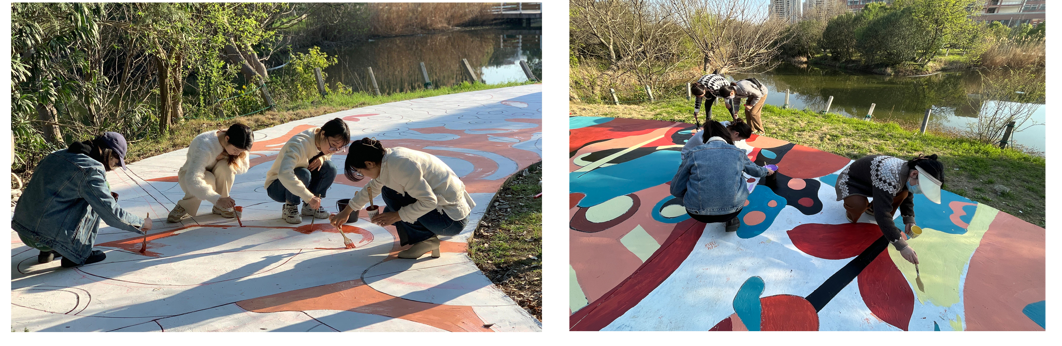 研究生第一党支部书记李梦园带领支部党员,对学院楼前的道路进行了彩绘美化的工作。他们令单调灰暗的小路一改往日形象,摇身变成主题鲜明、色彩突出的彩绘路面,成为了设计学院门前一道靓丽的风景线,更好体现出学院特色,进一步提升了学院道路景观效果,营造出干净、整洁、优美的校园环境。
