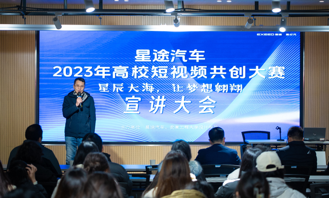 为搭建学生创新实践平台,激发学生创意创新创造力,推进校企合作共1211日,设计学院与星途汽车联合举办星辰大海,让梦想翱翔短视频共创大赛宣讲会。星途汽车营销中心副总经理程劲文、新媒体传播部总监郭海宝、产品主理人蒋明辉设计学院常务副院长张学东以及田培春、费利君、李颖等老师,来自全校的研究生本科生一百余人出席宣讲会