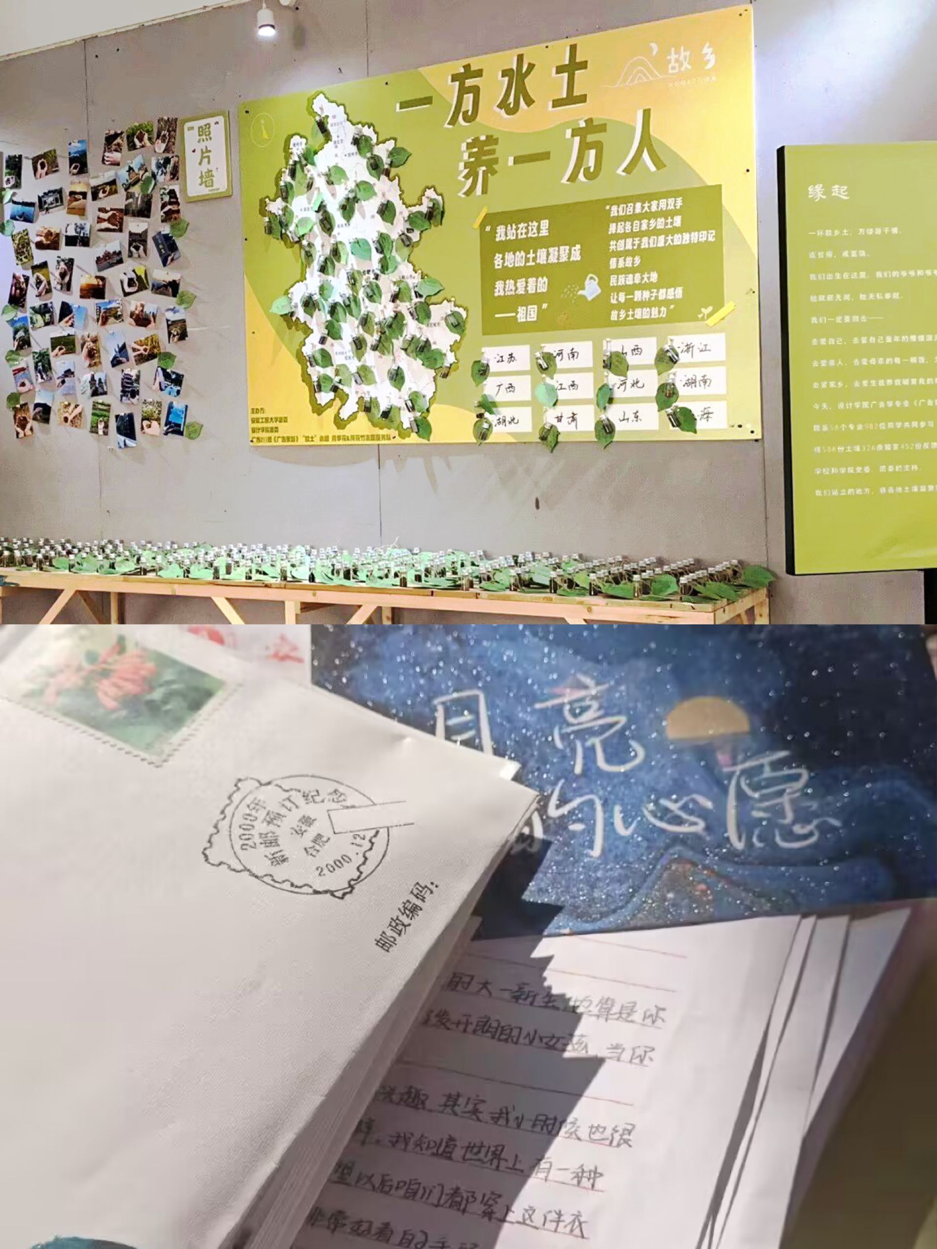 共创展墙悬挂了来自安徽各地区为主,以及全国其他省市采集的土壤。南到广东清远,北到黑龙江哈尔滨,西到甘肃白银,东到上海。样本照片墙张贴了同学们采集土壤时家乡的标志建筑为背景的现场照片。留言墙上,同学们写下对家乡的祝福,亦有对未来的期许。来自祖国各地区土壤共同织构起关于故乡的记忆:“我站在这里,各地土壤凝聚起来的——是为祖国。”