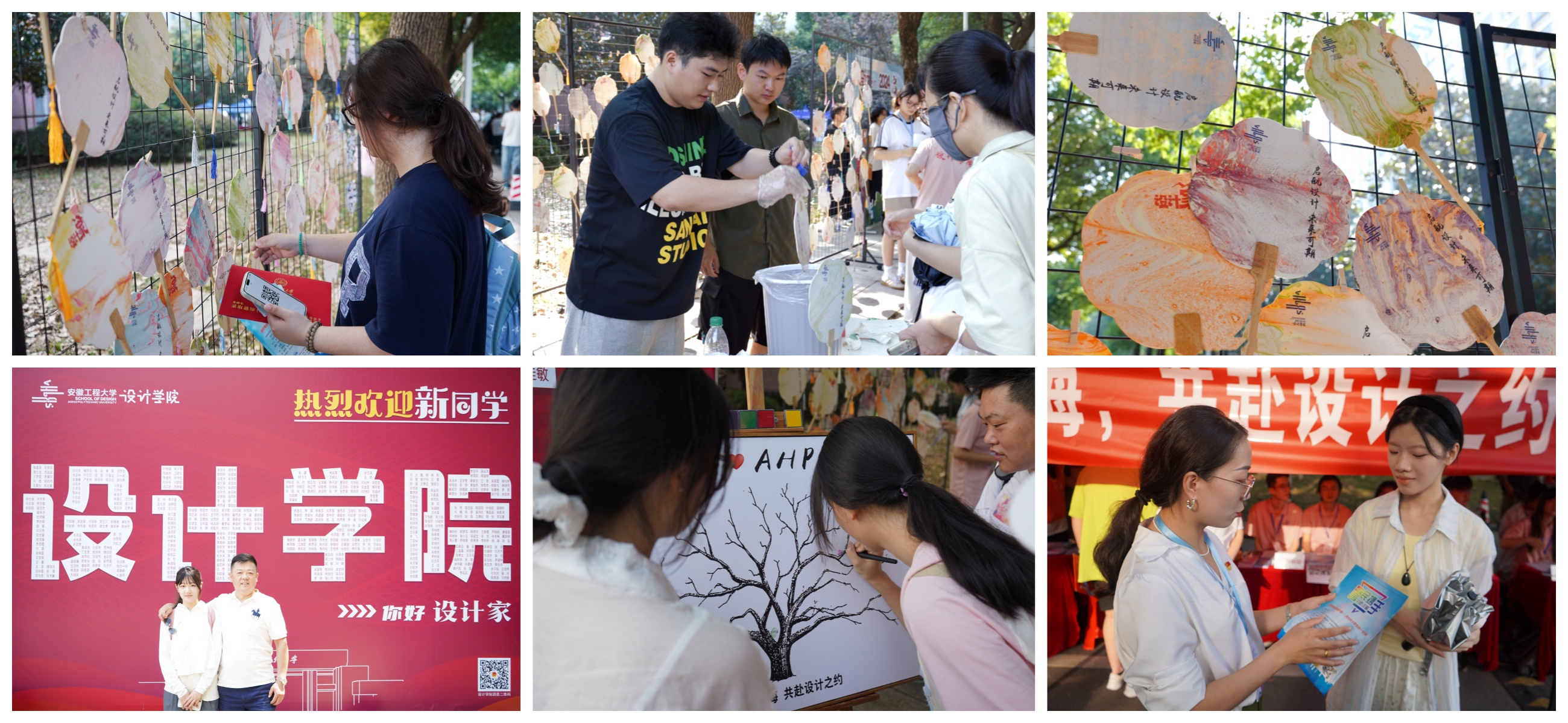 迎新现场,学院布置了“设计家”专属“签名墙”、“我与徽程的第一张合影”拍照打卡点、指纹签到画、大学生反诈宣传教育等,邀请每位新生留下大学旅程的独一无二起点印记,在徽程的沃土中深深扎根,茁壮成长。学院今年还创新依托专业特色,为每位设计新星定制了独一无二“设计家”牌漆扇,并现场诚挚邀请前来报到的新生们共同体验“漆”乐无穷的手工制作。漆扇活动现场排起了长队,秩序井然,气氛热烈。视觉传达设计专业的孙强蕊同学表示:“感谢学院组织了这场别具特色的漆画体验,这不仅激发了我对传统文化的浓厚兴趣,更在我的心中种下了创新与传承并重的种子。我一定要好好学习专业知识,坚持文化自信,通过自己的努力把优秀的传统文化传承下去。”相信每一把漆扇的诞生,都是对青春梦想的一次温柔献礼,它承载着学子们对未来大学生活的无限憧憬与美好愿景,如同初升朝阳,照亮了他们启航设计的征途。