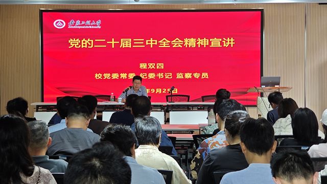 程双四的宣讲让全院教职工对二十届三中全会精神有了更深刻的理解,也为学院发展指明了方向,激励大家为推动学院高质量发展贡献力量。彭海燕表示,学习好宣传好贯彻好党的二十届三中全会精神是学院当前和今后一个时期的重大政治任务,学院党委将持续推进学习宣传贯彻党的二十届三中全会精神,带领全院师生进一步提高政治站位、强化责任担当,紧扣学校和学院发展中心工作,凝心聚力,真抓实干,把学习成效转化为推动事业发展的实际行动。