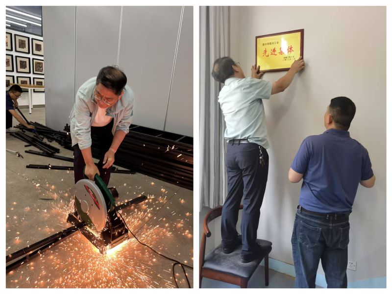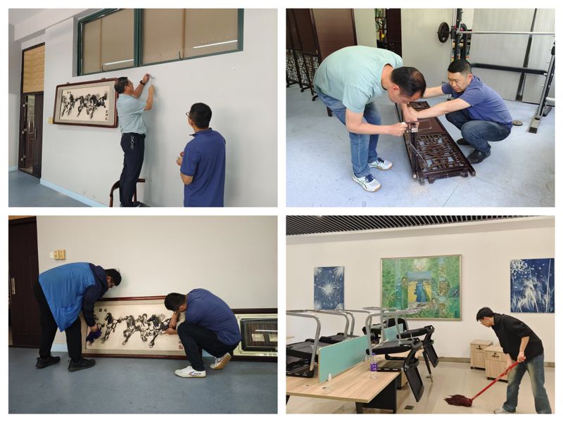 活动中,师生及家属齐心协力,对各个功能区域进行了彻底打扫,优化了空间布局,充分利用旧材料创新改造学院环境,并新增了多个展台与展示架,使学院环境更加整洁有序。同时,团队还在墙面钉挂了多幅艺术画作与设计作品,为学院增添了浓厚的艺术氛围。