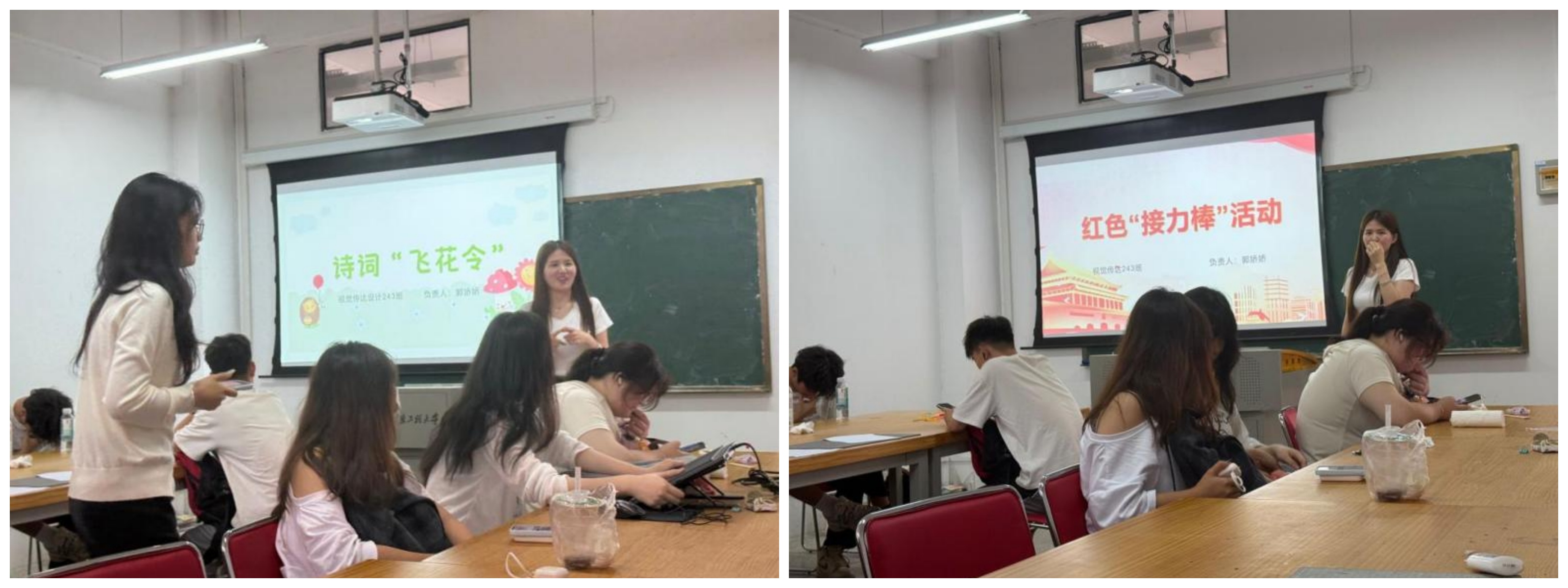 线下环节设置了“诗词飞花令”与“红色接力棒”活动。“诗词飞花令”以“桃”“荷”“菊”等单字花朵为线索,同学们提前查阅古诗词、熟悉规则。活动现场,团员们单人接龙对答含关键词诗句,答对得分,错误或超时扣分,积分高者胜出。在诗词交锋中,同学们领略古典文化魅力,增强文化理解。