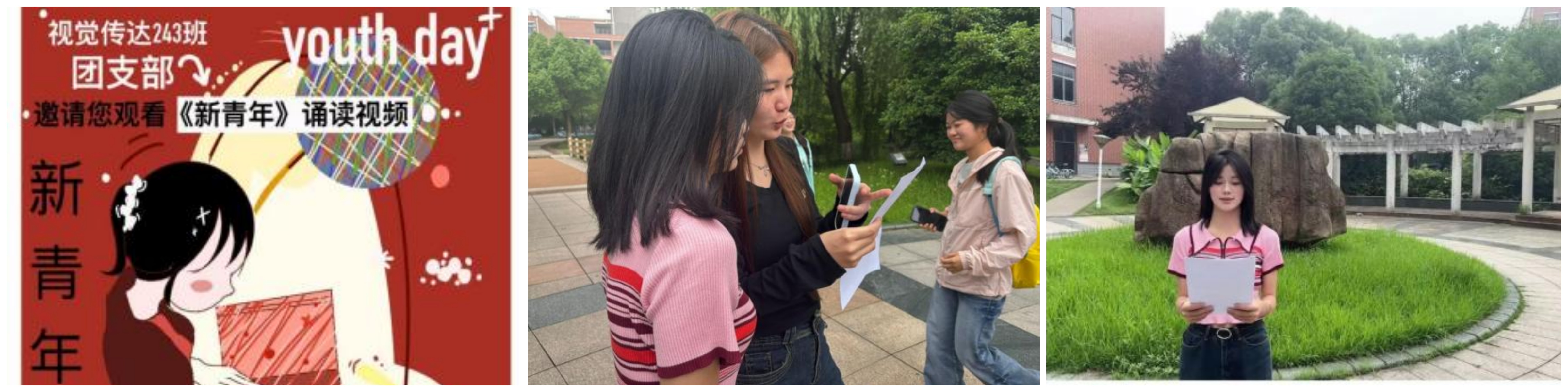 活动聚焦《新青年》杂志,开展接力诵读与海报设计。在团支书郭娇娇同学的带领下,团支部策划线上海报宣传,八位同学在校园不同地点接力拍摄朗诵视频。他们精心挑选杂志经典文章片段,以青春之声传递先辈思想。